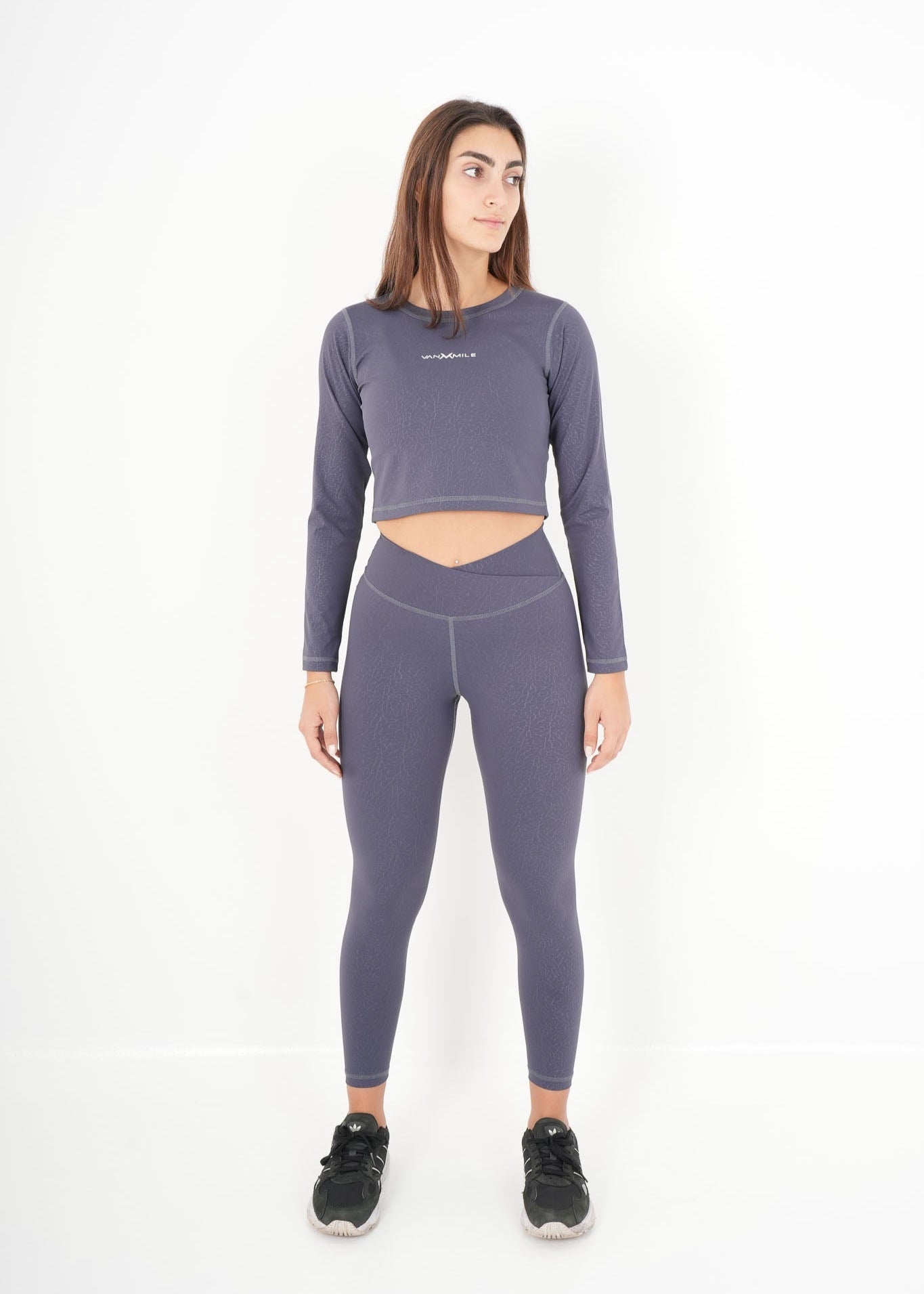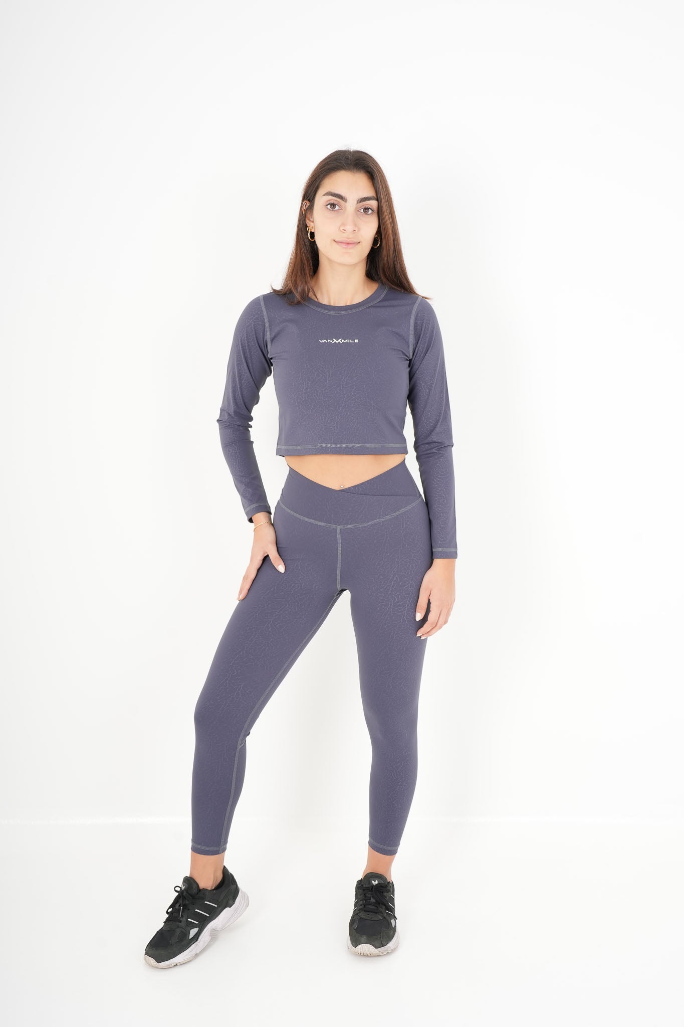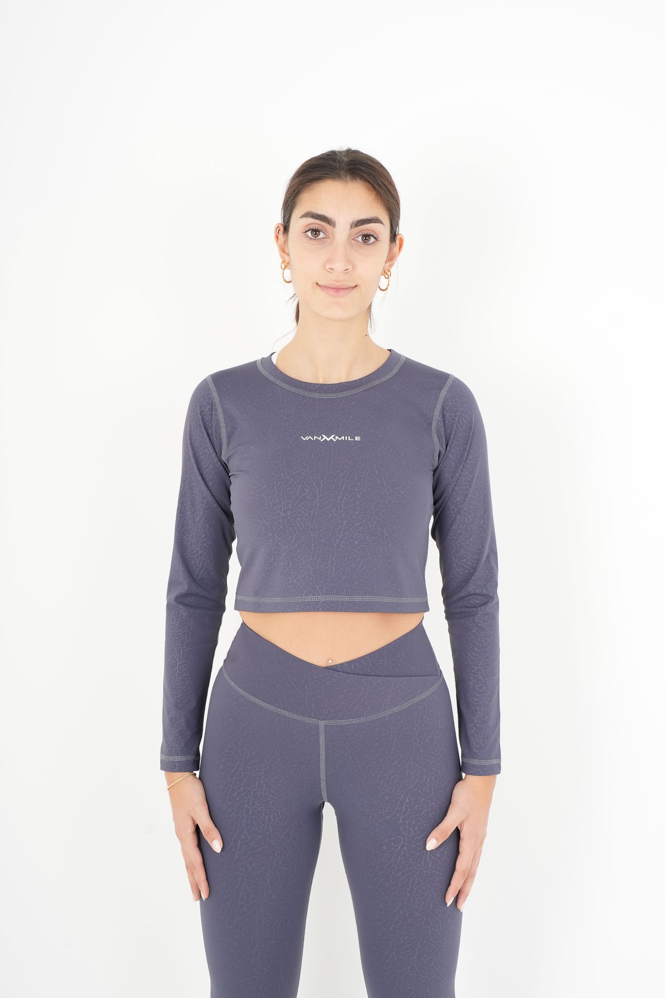 The cropped long-sleeve top has a clean, minimal cut that hits perfectly above the waistband, creating a seamless and athletic silhouette.