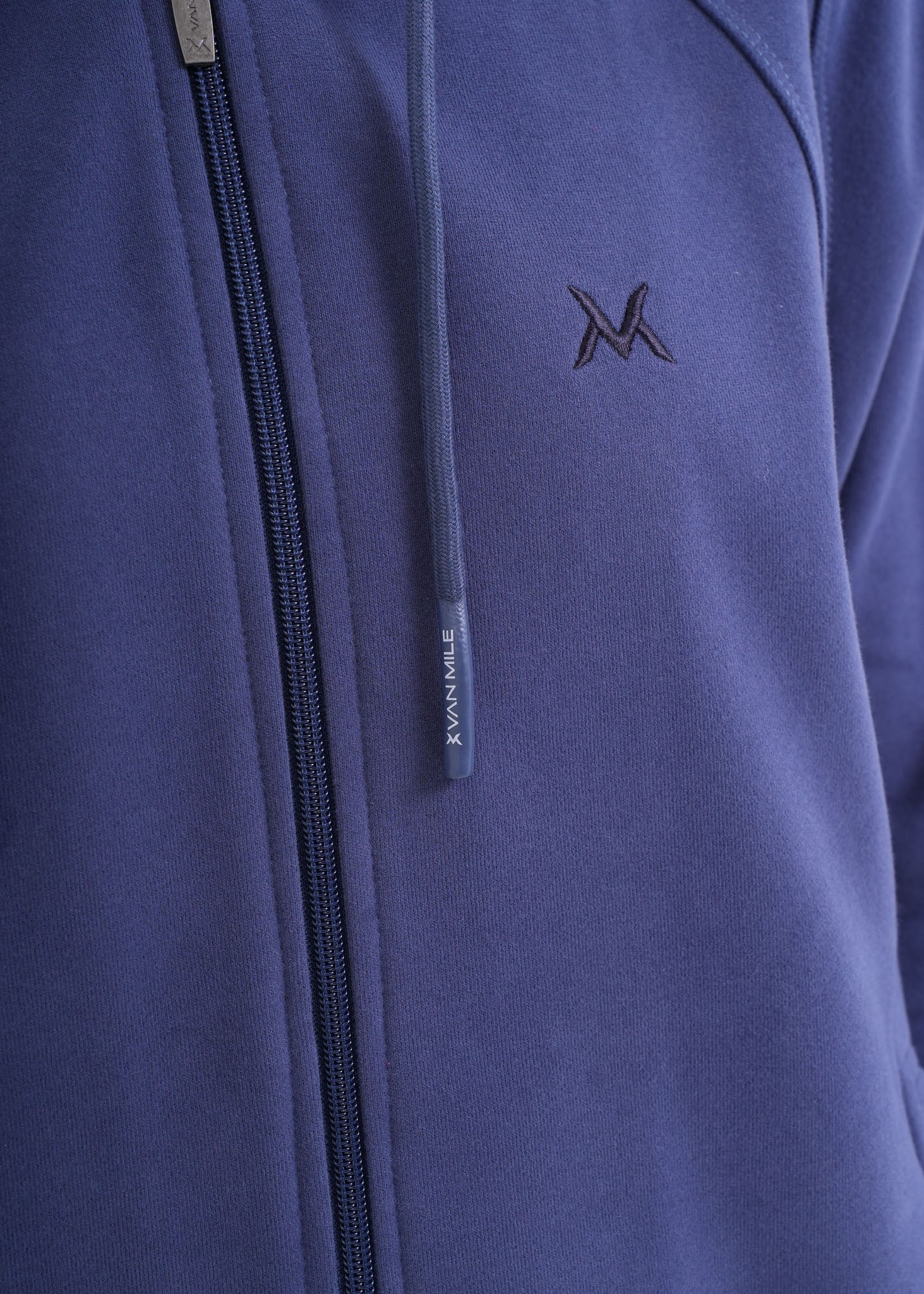 Embroidered VAN MILE logos on forearms and chest